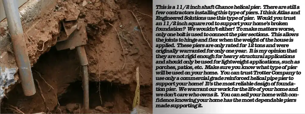 Trotter Company is a full service foundation repair/stabilization contractor. No matter why your structure is settling, Trotter Company can stabilize it! With 80 years working in our red clay, Trotter Company is the most experienced foundation repair contractor in Georgia. We are the only contactor to offer a Composite Helical Pier as our standard pier. This pier offers the stability of a foundation provided by the helix and the rigidity of the large diameter pipe pier. The overall strength of our pier is reinforced with a concrete core. All major repair contractors are following Trotter Company’s lead and are promoting helical pipe piers.